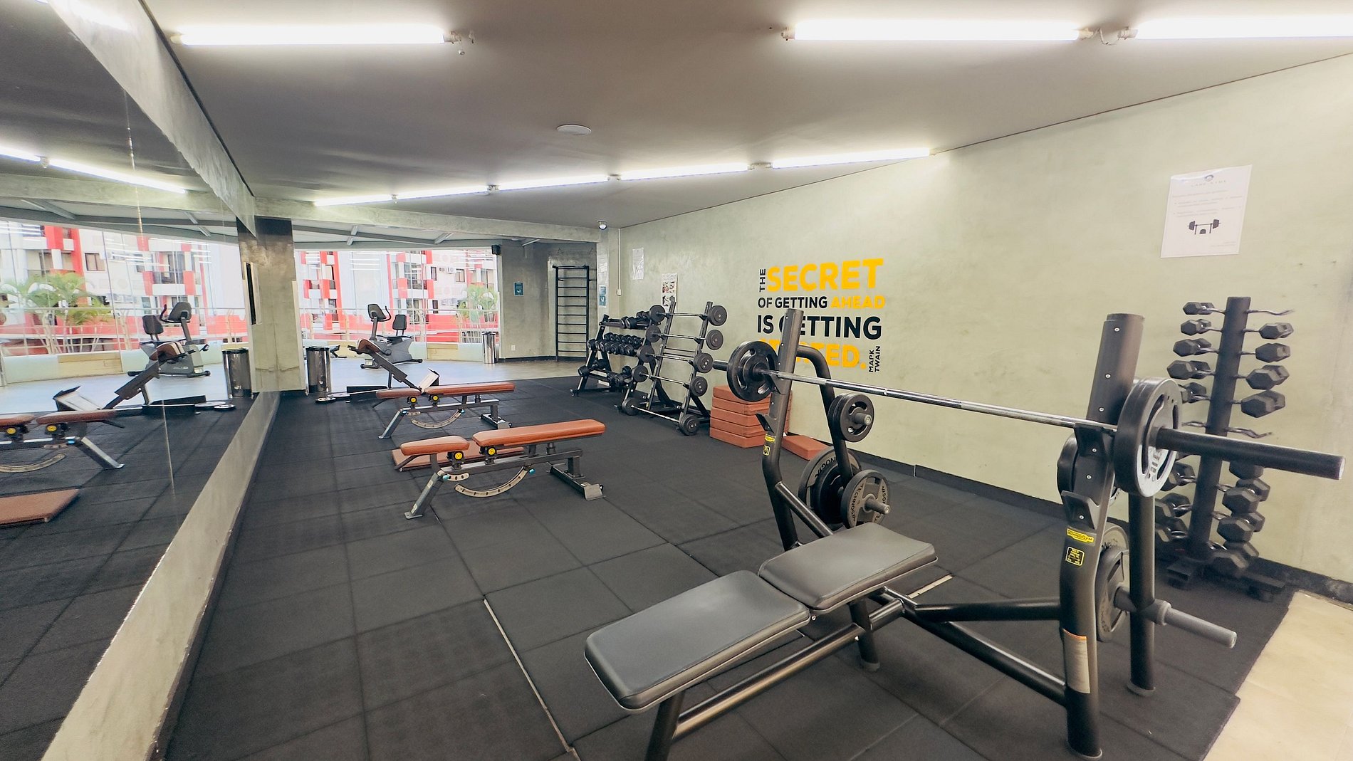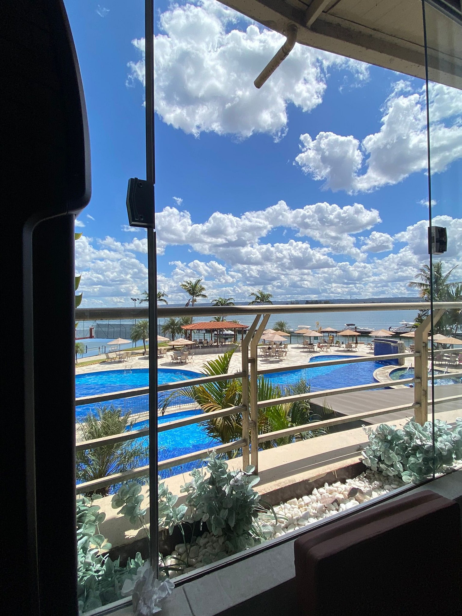 A piscina e a academia com uma vista linda para o lago paranoa