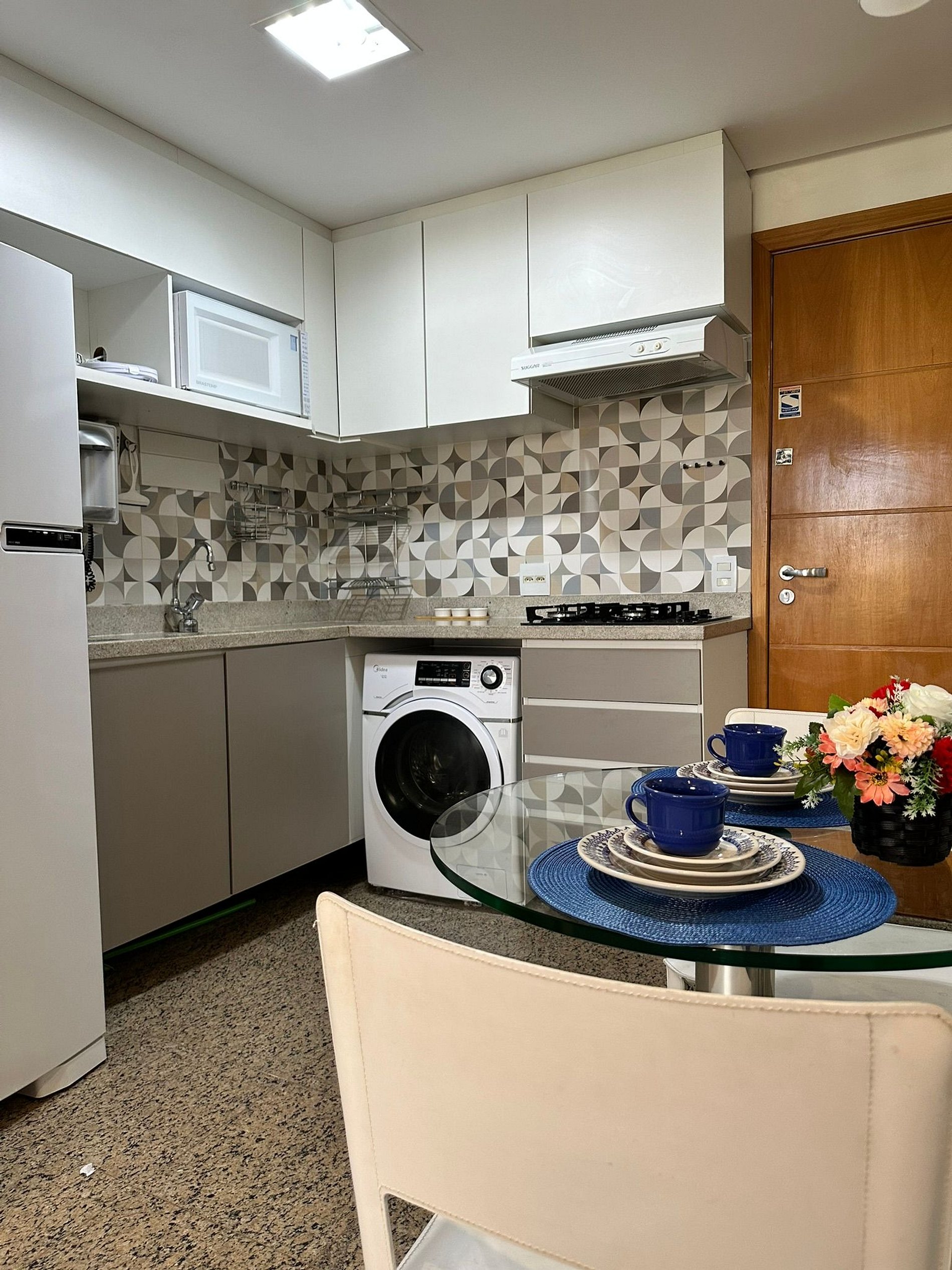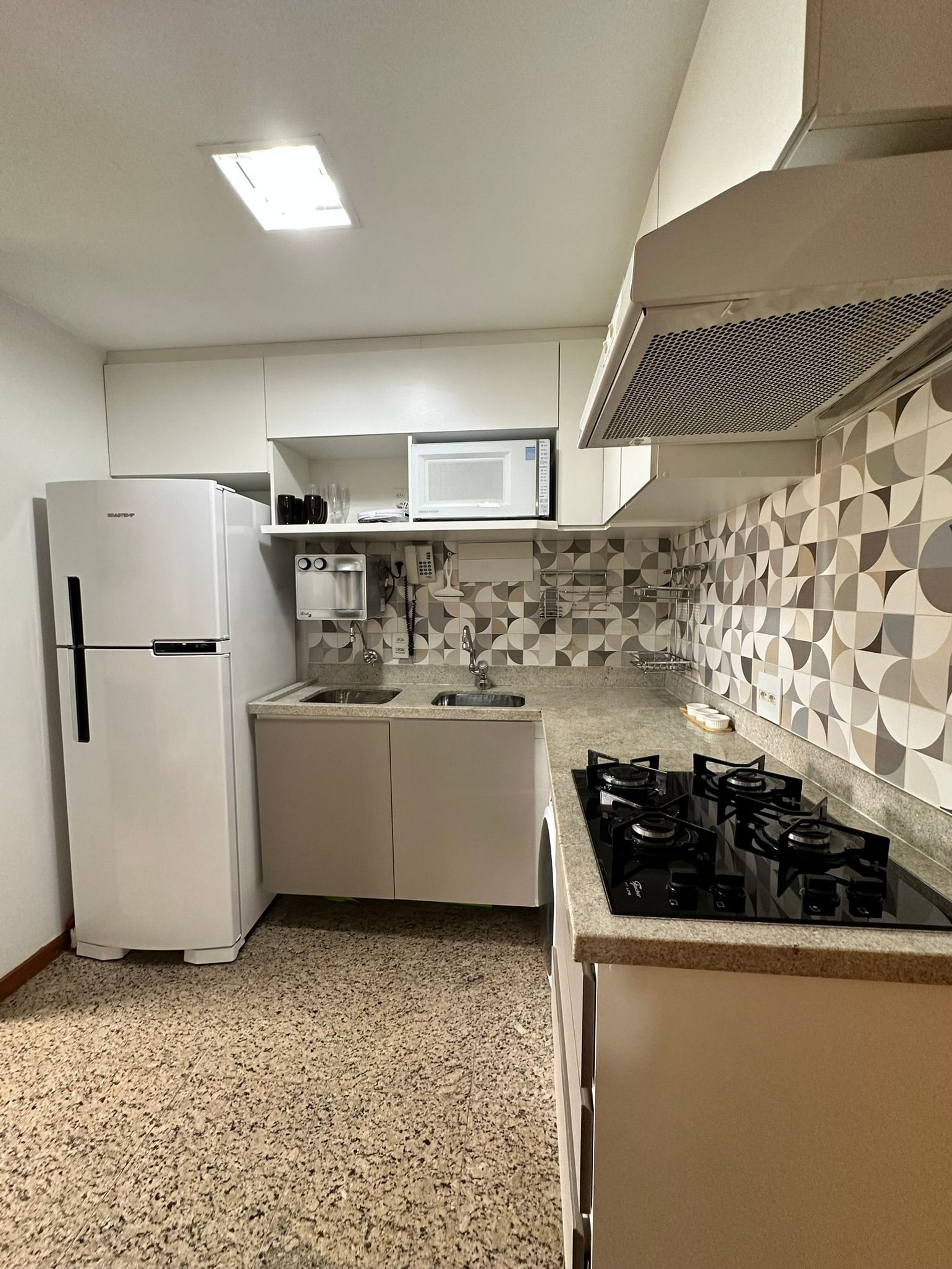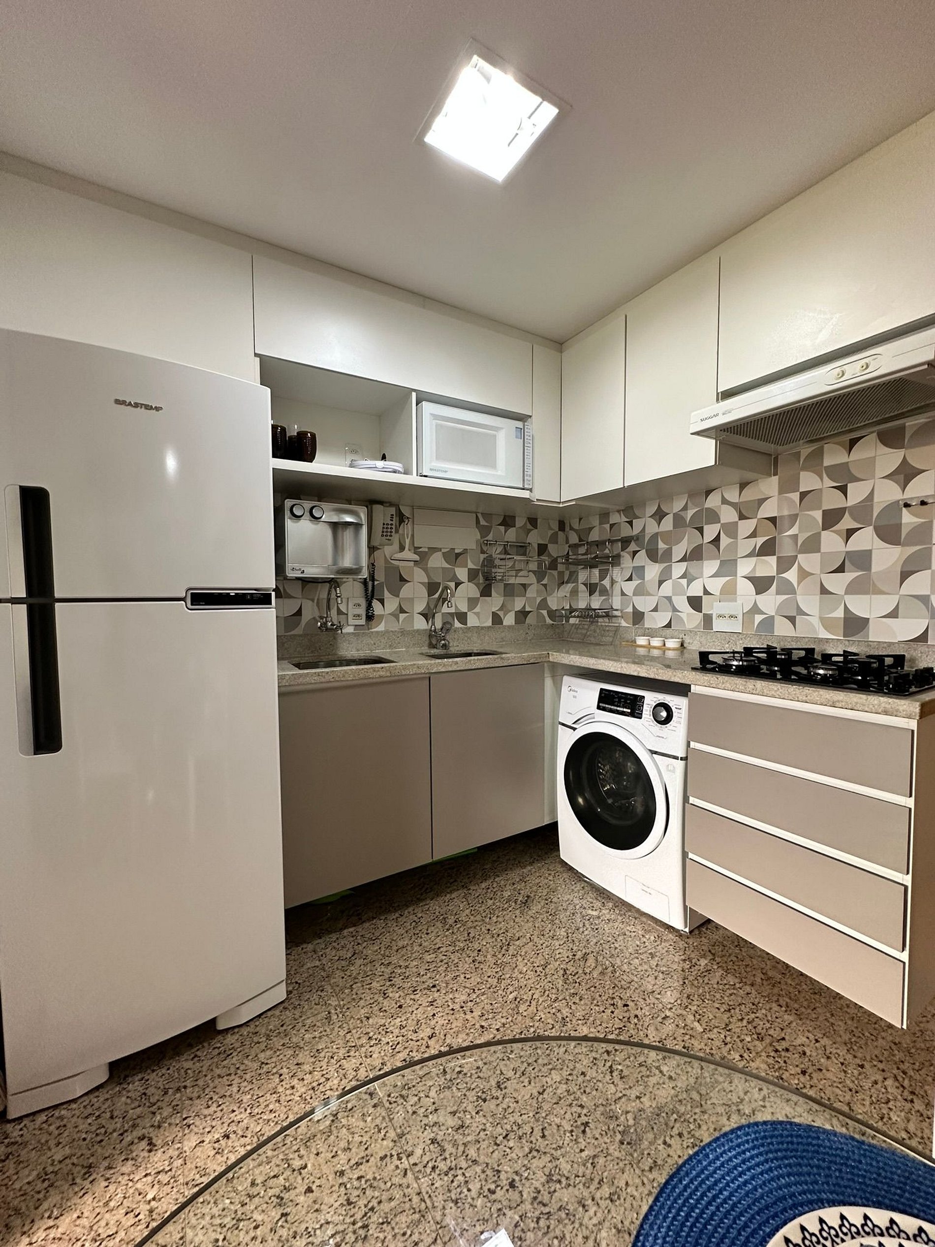 O flat também conta com 2 ar-condicionado, proporcionando um ambiente agradável e climatizado em qualquer estação do ano. A cozinha está totalmente equipada, incluindo fogão , micro-ondas , fornecendo conveniência e praticidade para os hóspedes. Além disso, um purificador de água gelada está disponível, assegurando uma fonte de água fresca a qualquer momento.