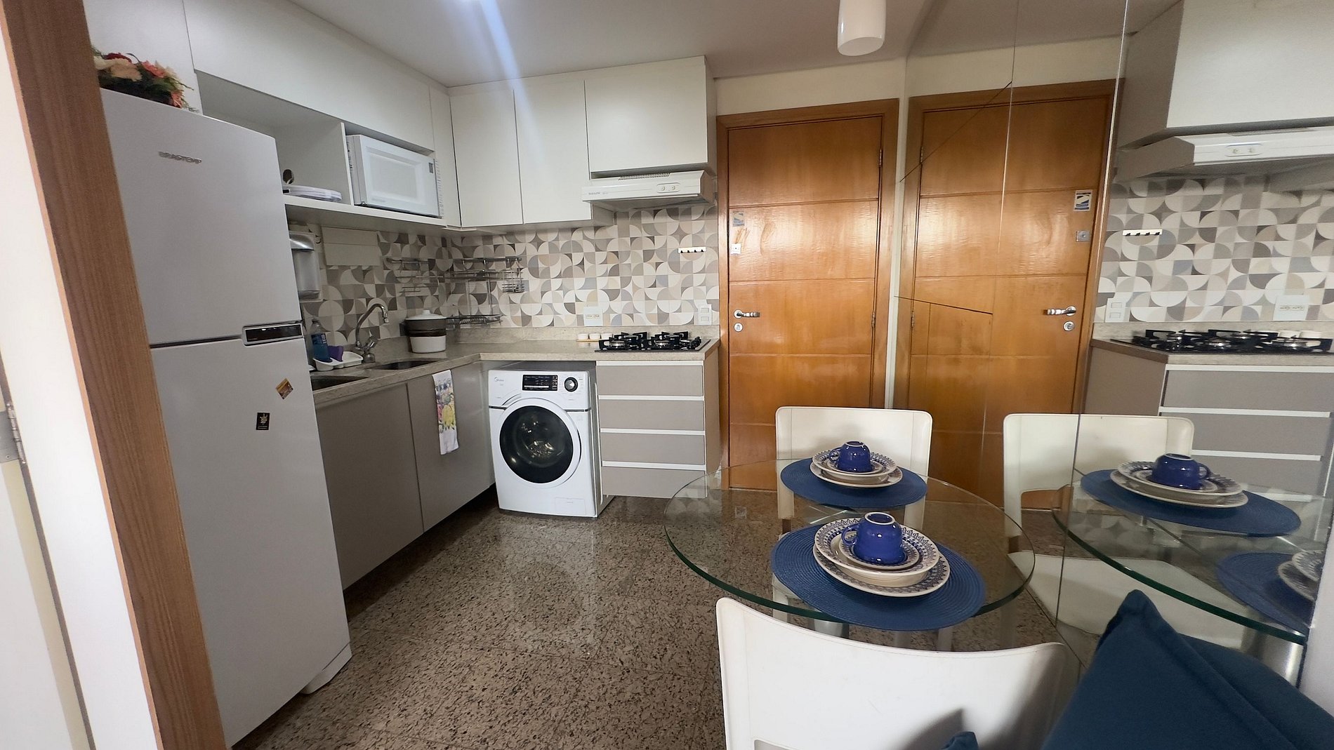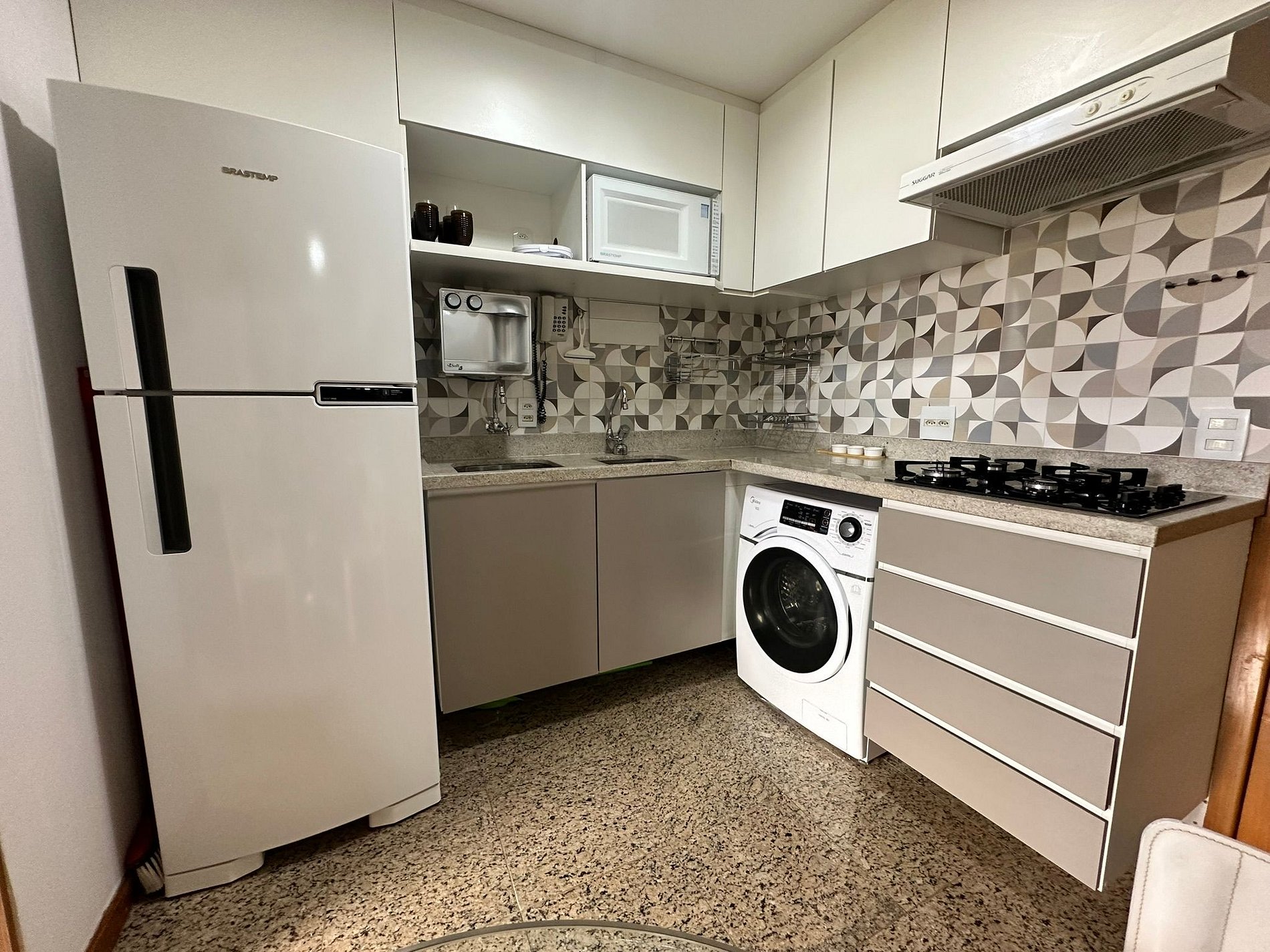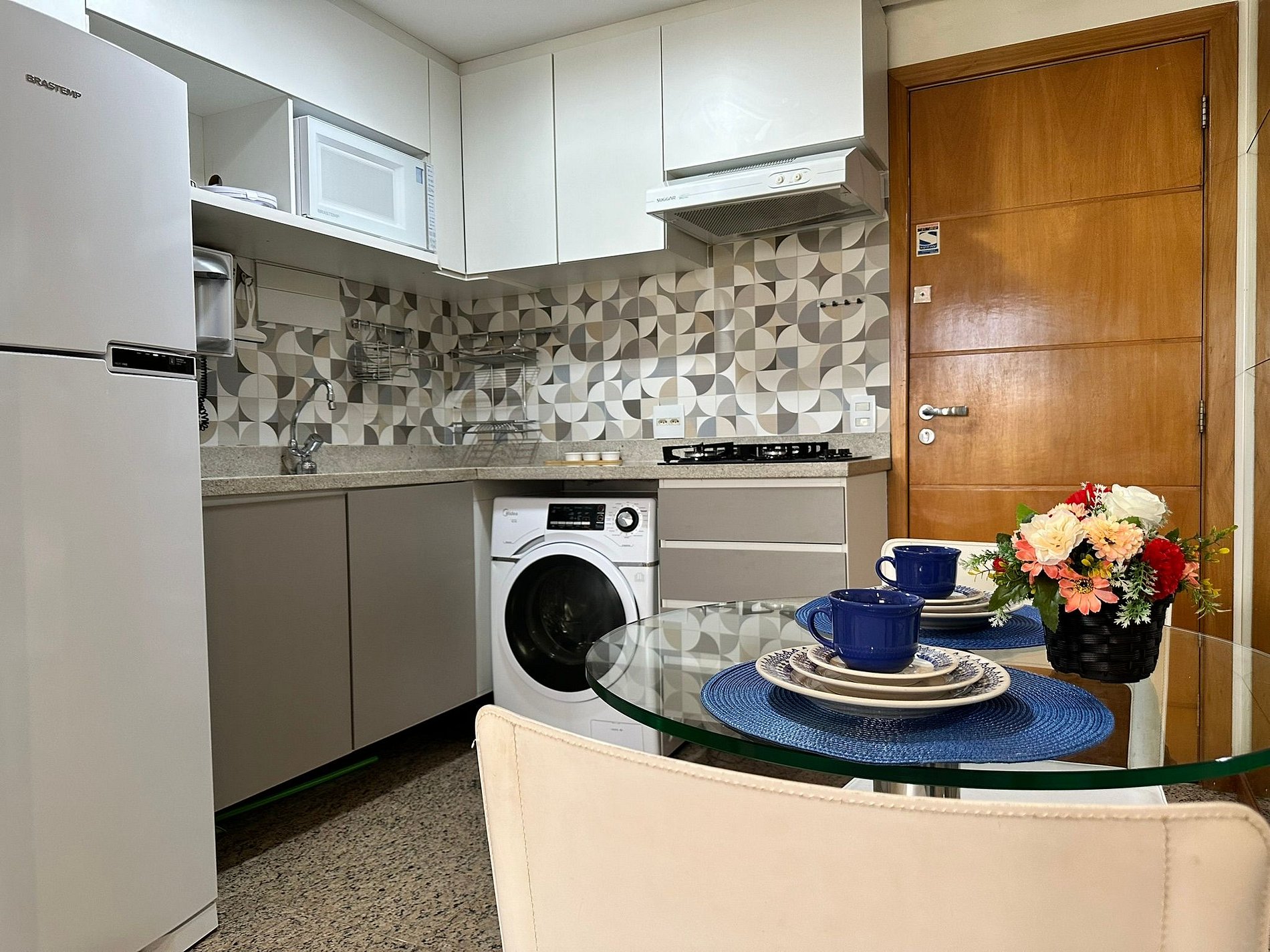O flat também conta com 2 ar-condicionado, proporcionando um ambiente agradável e climatizado em qualquer estação do ano. A cozinha está totalmente equipada, incluindo fogão , micro-ondas , fornecendo conveniência e praticidade para os hóspedes. Além disso, um purificador de água gelada está disponível, assegurando uma fonte de água fresca a qualquer momento.