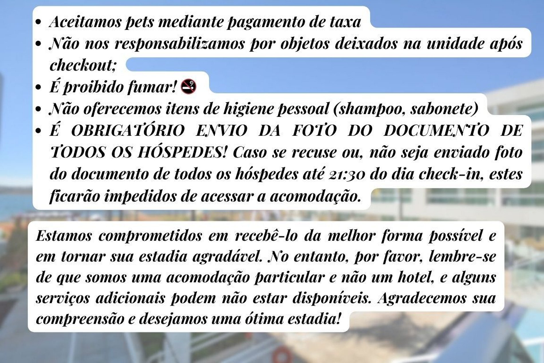 Por favor, lembre-se de que é obrigatório enviar a foto do documento de todos os hóspedes até as 22:00 do dia do check-in, para que possamos garantir uma estadia segura e tranquila para todos os nossos clientes.