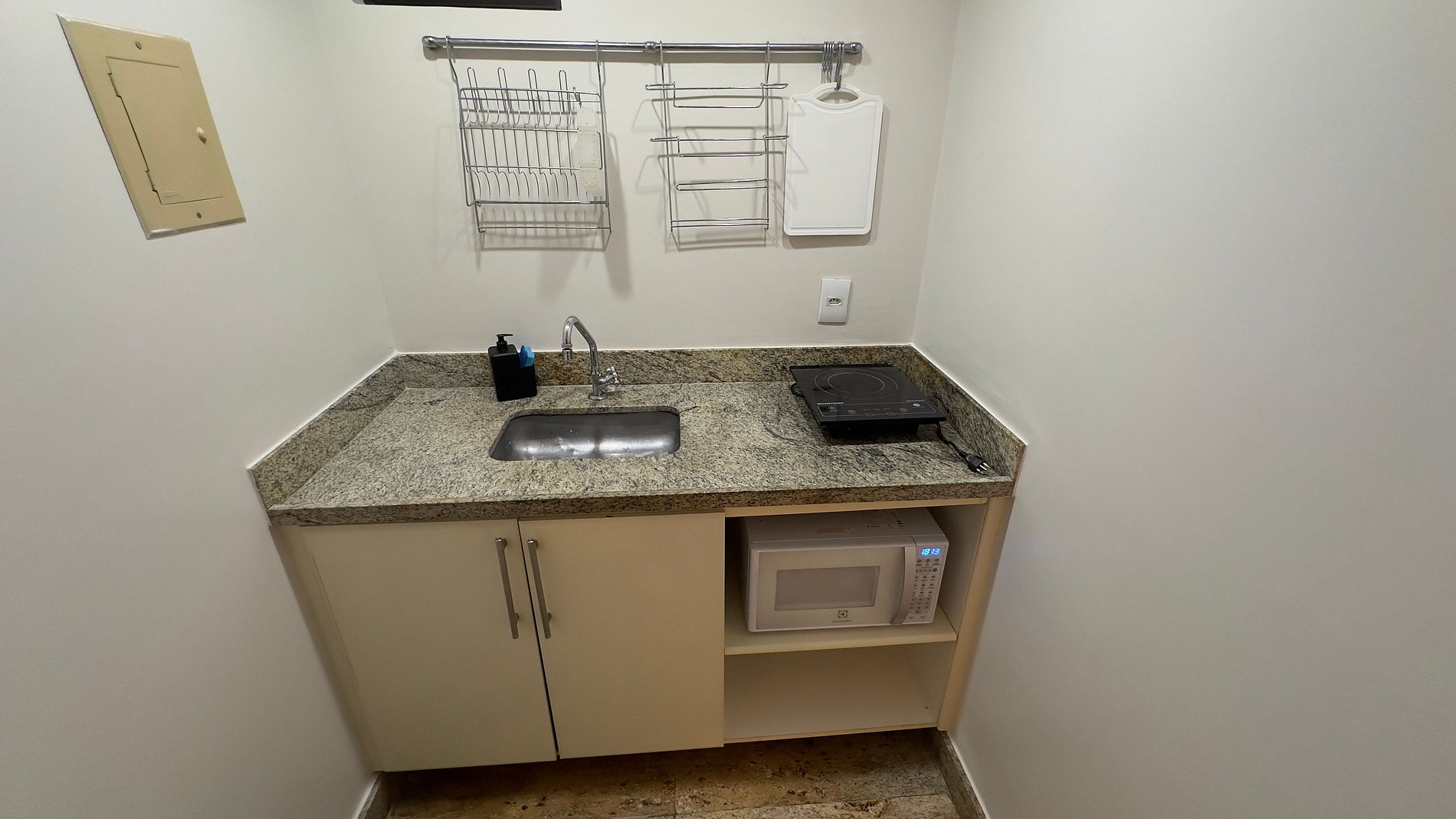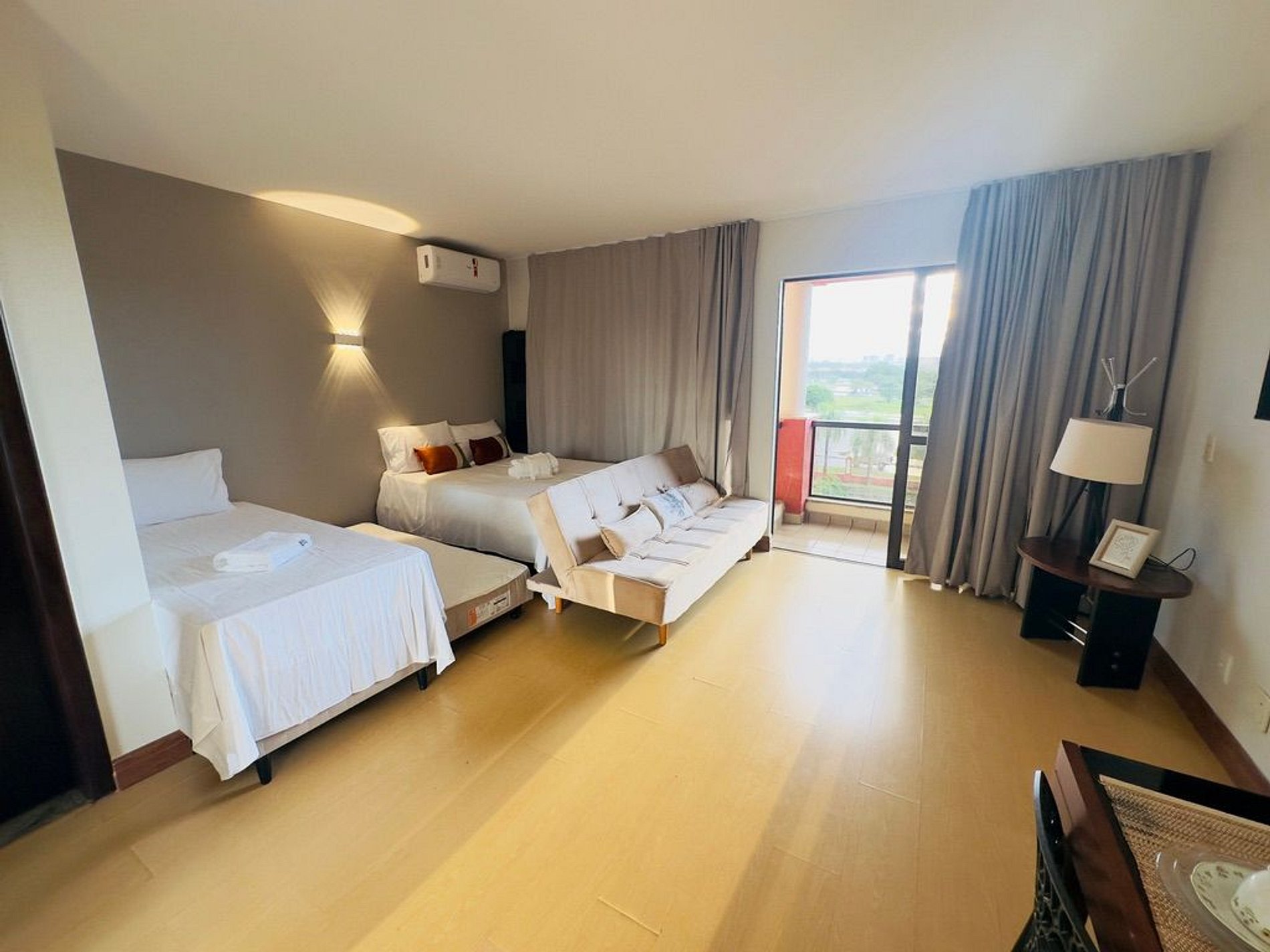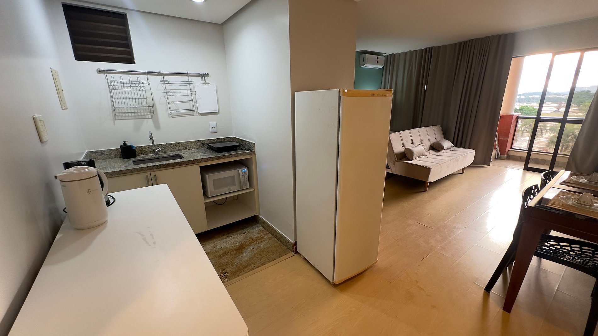 O apartamento possui Wi-fi, televisão SMART, cama casal e cama solteiro com auxiliar, sofa-cama, uma linda vista para o lago, além de uma cozinha equipada com cafeteira, sanduicheira e fogão.