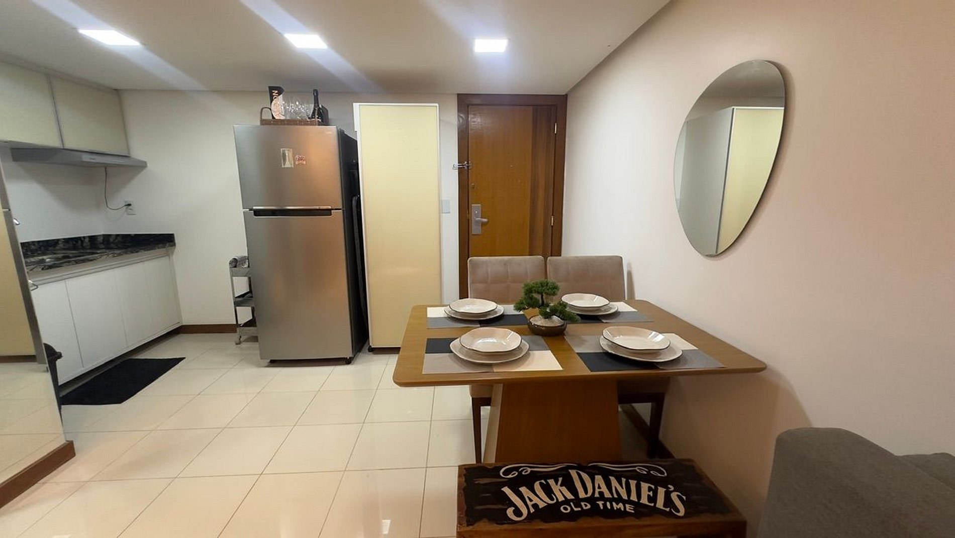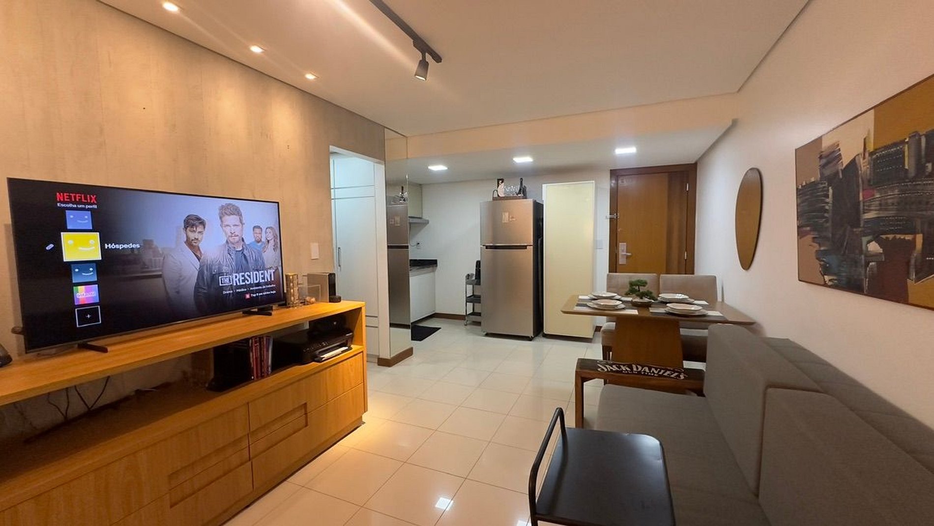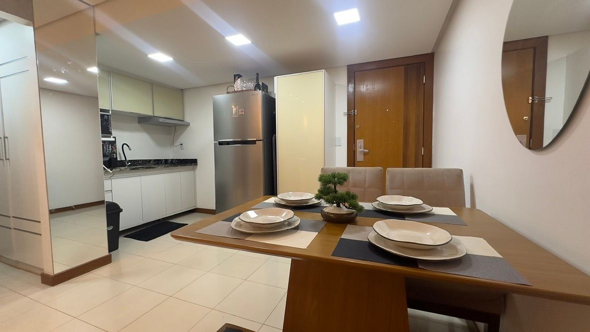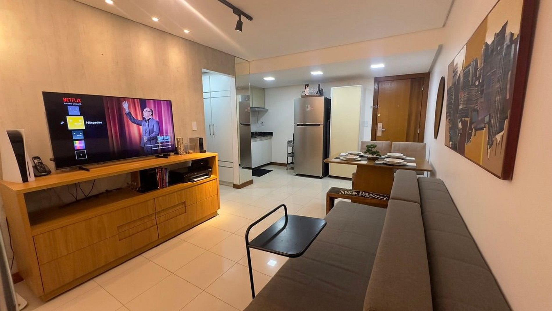 o apartamento conta com sanduicheira, cafeteira, pratos, copos, talheres, taças, air fry, roupa de cama inclusa, toalhas para todos os hóspedes, TV Smart, Internet de 500mb e muito mais.