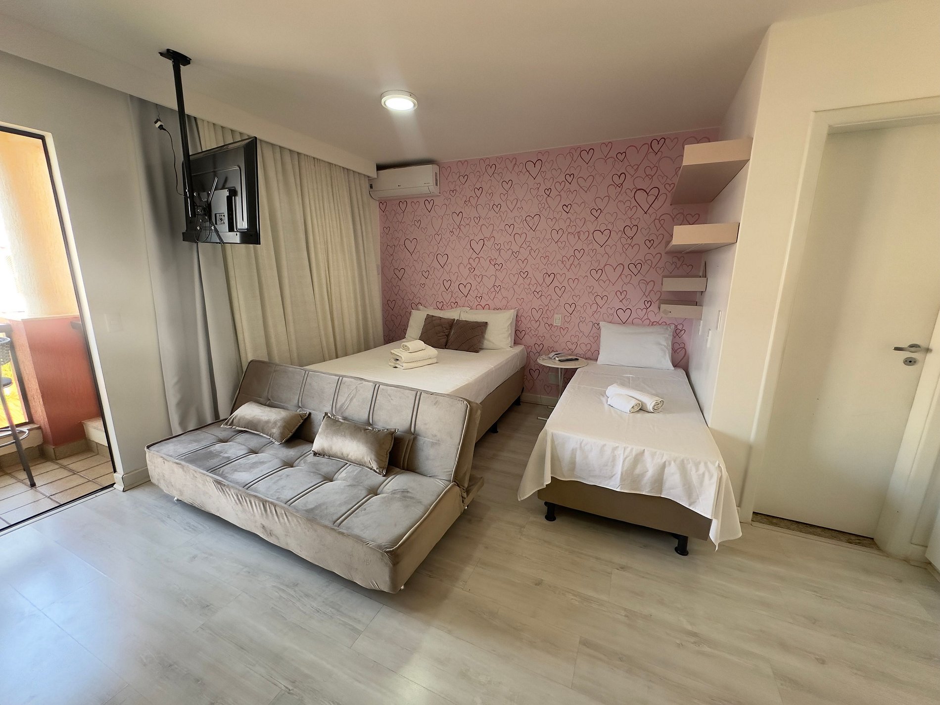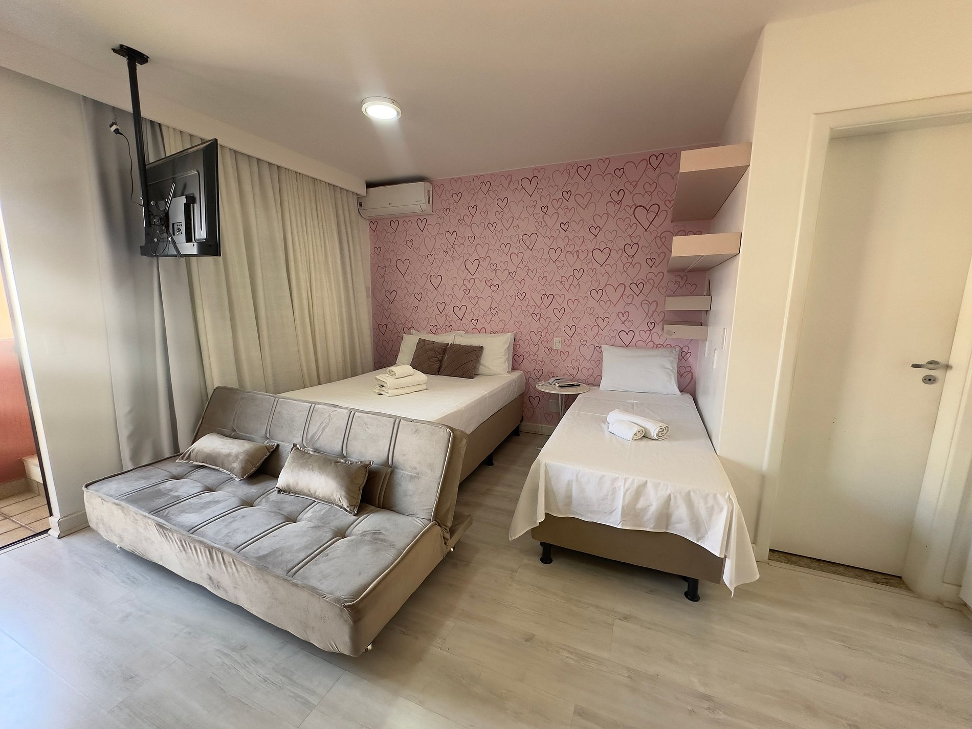 o apartamento possui 1 cama casal, 1 cama solteiro + auxiliar e 1 sofá-cama. possui purificador de água.