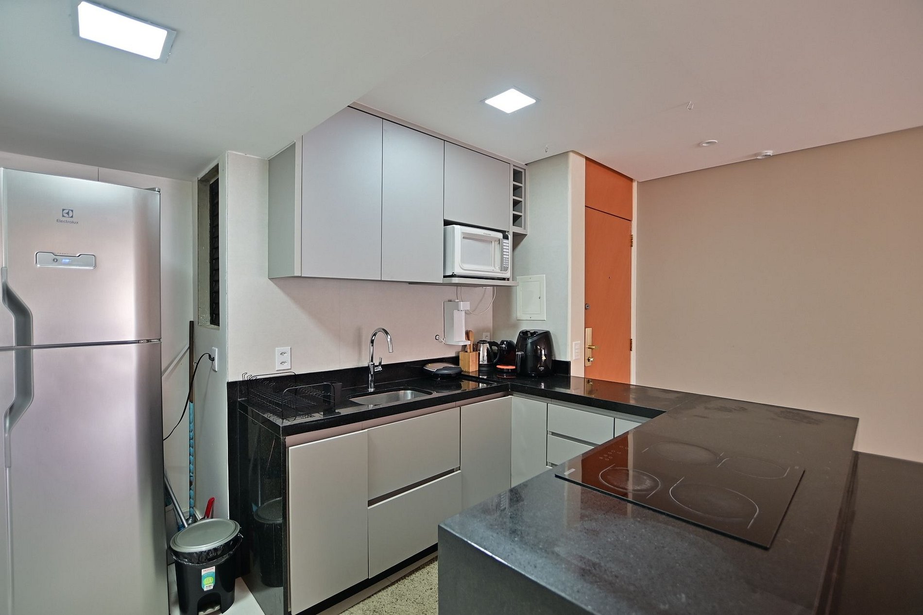 Por favor, lembre-se de descartar o lixo na lixeira na saída de emergência próxima ao elevador.